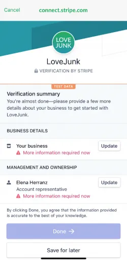 Once the documents have been uploaded for each account representative or "More information required now" disappears, click 'Done' which completes the Stripe process and returns you to the end of the LoveJunk registration. You should then see the following modal.