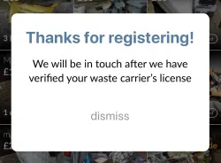 Congratulations! You've finished the registration process. We'll get back to you shortly. This typically takes no more than 48 hours as we verify details like your waste carrier license number and disposal sites. Please note you will not be able to collect any listings until your account is approved. If you experience any issues during this process, please email [email protected]. We are happy to help!